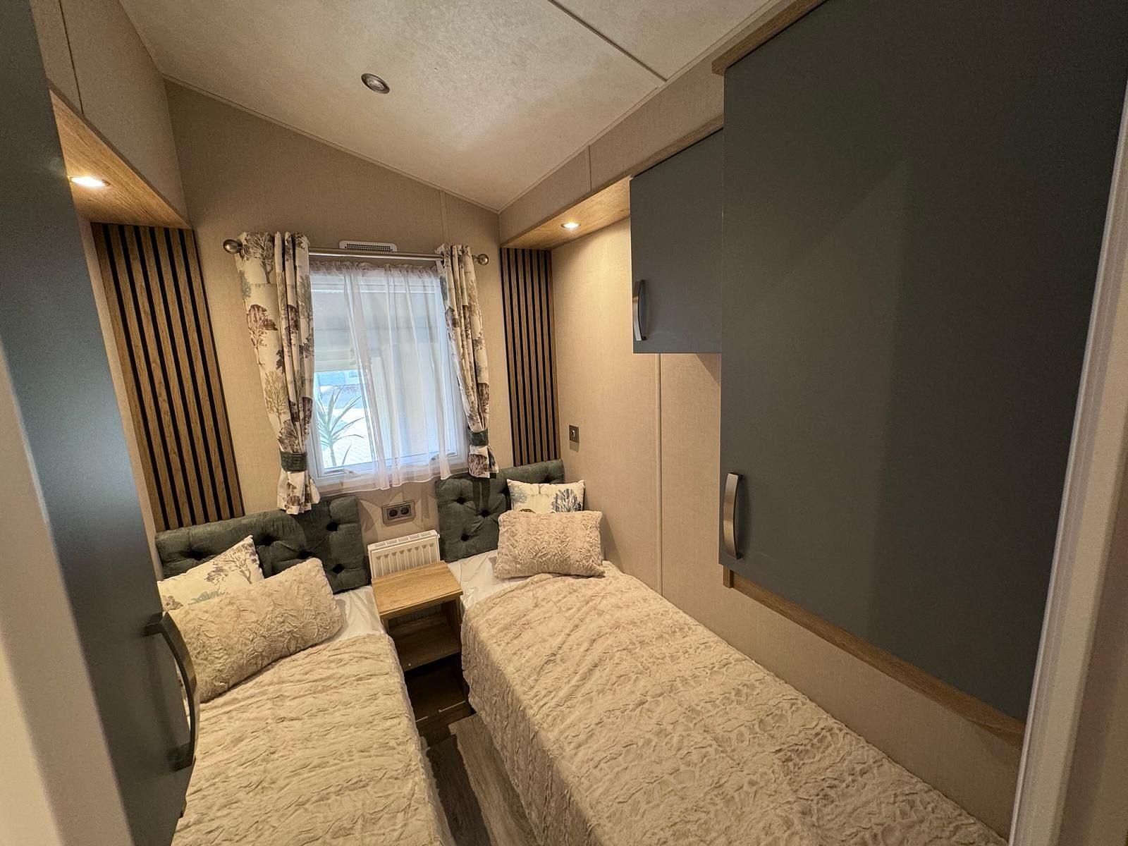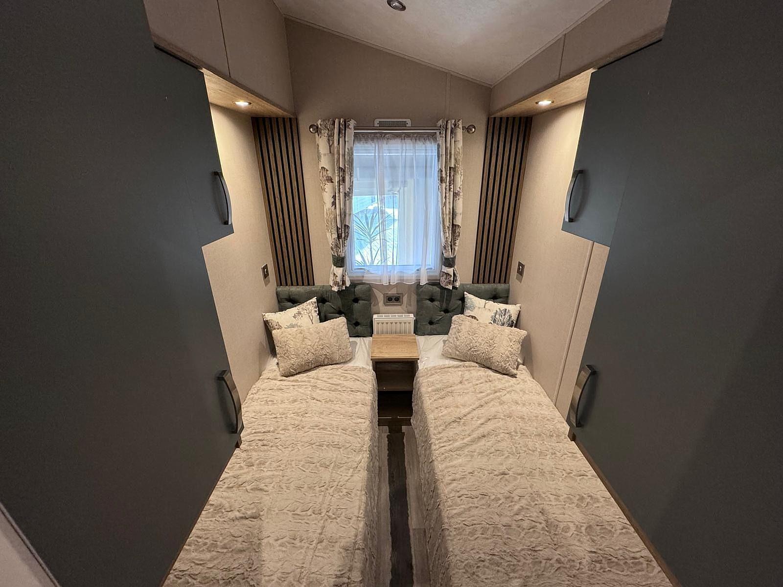 De slaapkamers zijn ingericht met comfortabele bedden, luxe hoofdeinden en ruime inbouwkasten die zorgen voor voldoende opbergruimte. Het verhoogde plafond en het volledige vinyl interieur creëren een gevoel van ruimte en licht, terwijl de slimme led-spotjes zorgen voor een warme en gezellige sfeer.